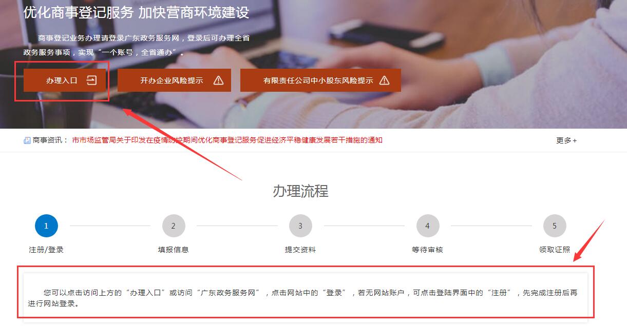 2. 選擇 “商事主體登陸” 點擊進入,并進行賬號 “注冊“ ”,以及 “登陸” 賬號;