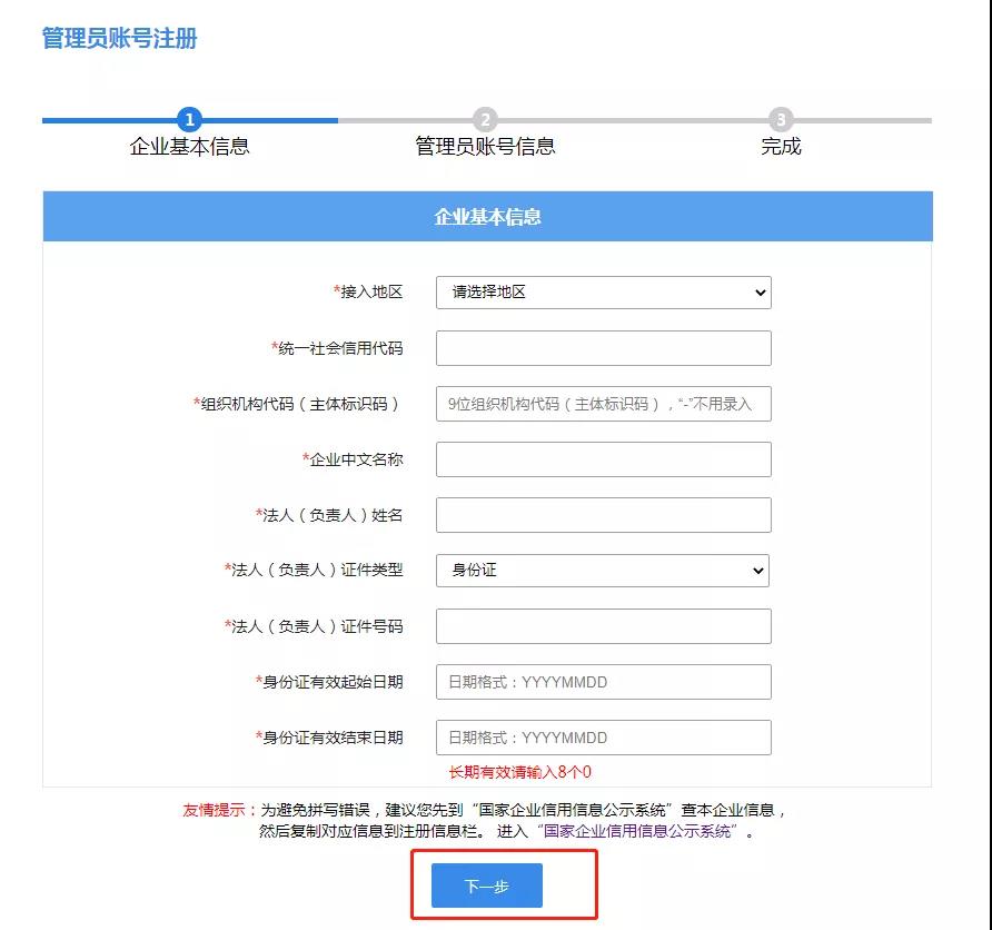5、填寫企業(yè)基本信息后,點(diǎn)擊“保存企業(yè)基本信息,下一步”。