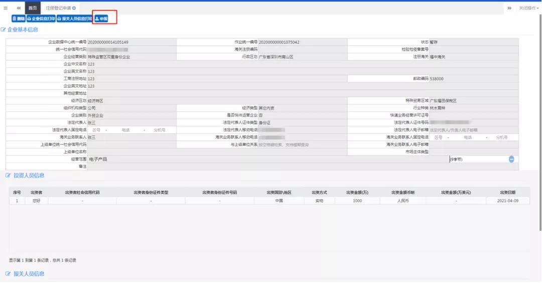 9、當(dāng)以上信息均填寫完畢,便可向海關(guān)進(jìn)行申報(bào)操作: