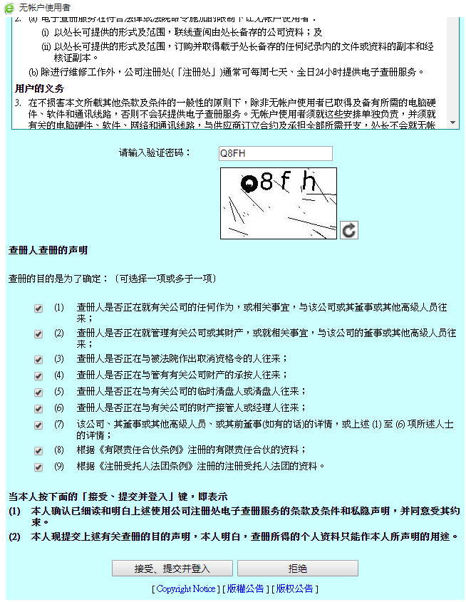 3、輸入驗(yàn)證碼,注意大小寫必須一直,否則驗(yàn)證碼會(huì)出現(xiàn)錯(cuò)誤導(dǎo)致無法進(jìn)入平臺(tái)。將查冊(cè)目的選項(xiàng)全部勾選,可不用再返回界面勾選,點(diǎn)擊“接受、提交并登入”進(jìn)入。