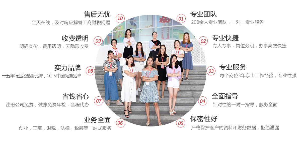 我司兩百余名專業(yè)顧問團(tuán)隊(duì),積累多年豐富的行業(yè)經(jīng)驗(yàn),精通熟悉政府操作流程,根據(jù)不同行業(yè)客戶需求,提供專業(yè),全方位的工商注冊、財(cái)稅代理建議,認(rèn)真對待每一項(xiàng)業(yè)務(wù),讓您真正的省錢、省心,做到時(shí)時(shí)跟進(jìn),完全讓您放心!老品牌值得信賴!