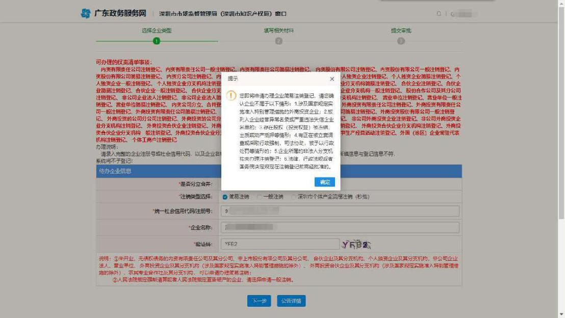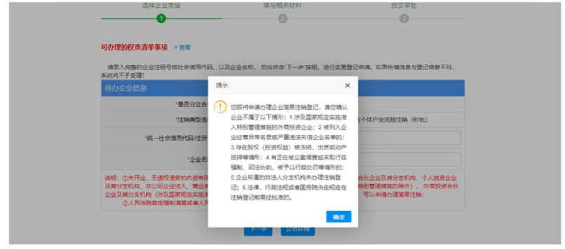 4、勾選選擇簡(jiǎn)易注銷,輸入企業(yè)相關(guān)信息,點(diǎn)擊下一步進(jìn)入簡(jiǎn)易注銷公告填報(bào)功能。
