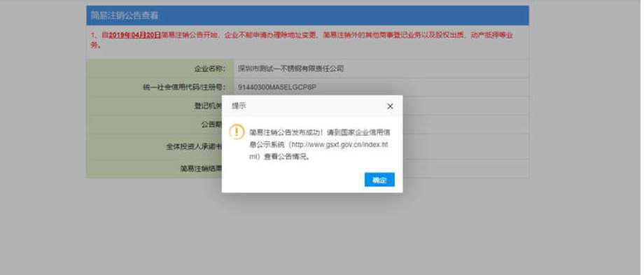 8、簡(jiǎn)易注銷公告發(fā)布成功后,公告信息將同步到國(guó)家企業(yè)信用信息公示平臺(tái),可到該公示平臺(tái)上查看公告情況。